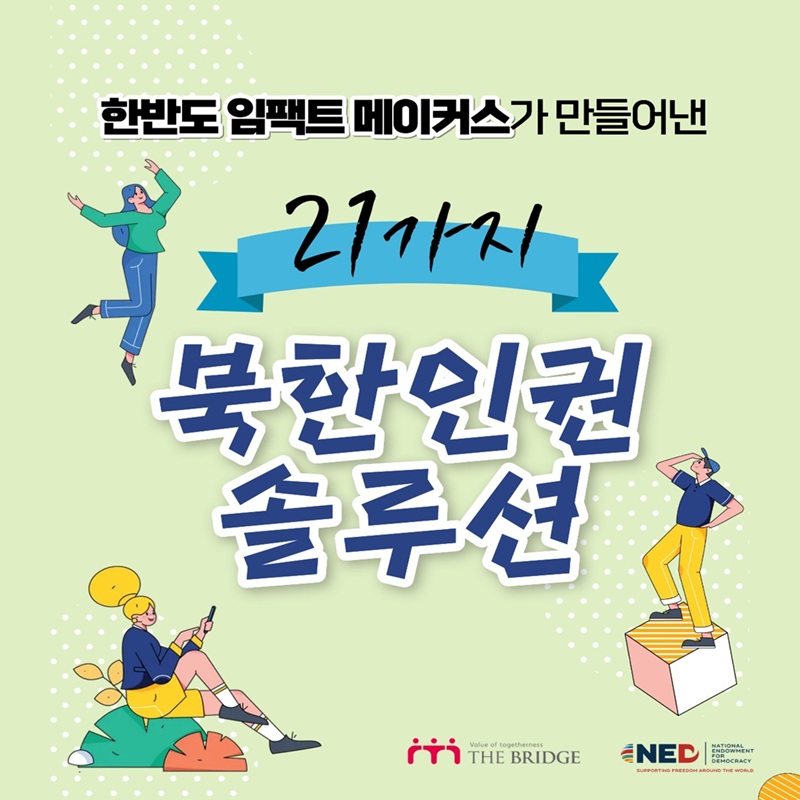 남북 청년들이 함께 만든 21개의 북한 인권 솔루션을 소개합니다! 🌍 ‘한반도 임팩트 메이커스’에서 청년들은 탈북민 청년들의 경험을 바탕으로 북한 지역사회의 문제를 새롭게 정의하고 직접 해결 아이디어를 만들었어요. 이렇게 탄생한 21개 솔루션은 식품·보건, 교육, 여성, 에너지 등 일상과 밀접한 문제를 다루고 있습니다. 무엇보다 바로 실행할 수 있는 ‘작은 변화’를 목표로 한 실천형 아이디어라는 점이 특별해요. 청년들의 시선에서 시작된 변화의 씨앗들, 함께 확인해볼까요? ✨📘
